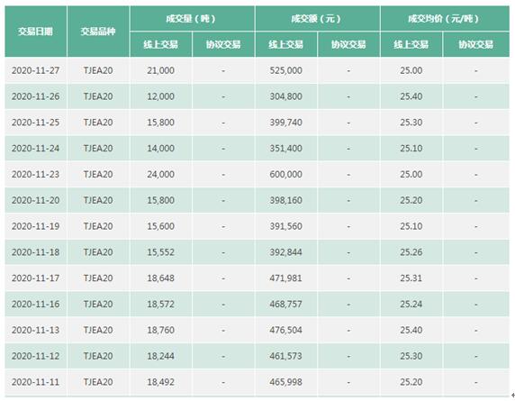 從2020年11月20日-12月16日數(shù)據(jù)來看,交易量高點為12月4日的12533噸,存在交易體量不足和價格波動較大等特點。