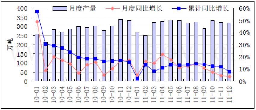 2010-2011年全國原煤月度產(chǎn)量及同比增速