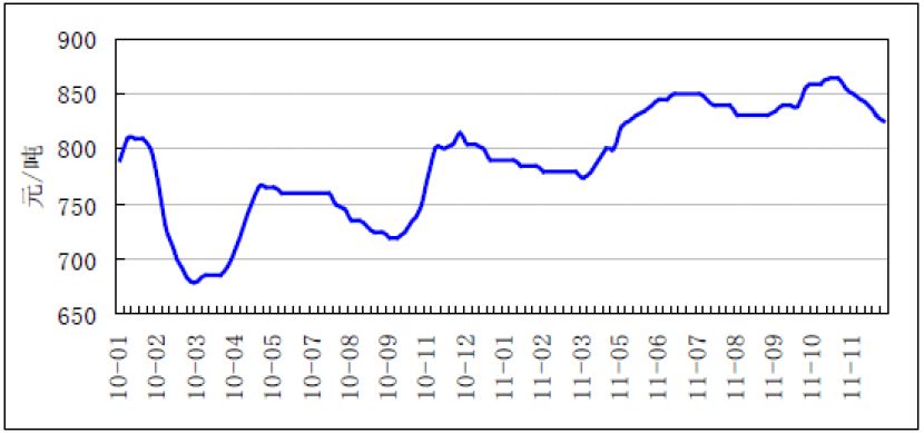 2011年全國煤炭價格呈現(xiàn)波動態(tài)勢,雖然煤炭產(chǎn)量也保持了快速增長勢頭,但受需求旺盛影響,2011年煤價整體再度上了一個臺階。據(jù)測算,2011年,秦皇島港5500大卡動力煤平均最低平倉價為814元/噸,與2010年相比,每噸上漲超過70元,漲幅接近10%。與動力煤相比,煉焦煤、噴吹煤和無煙塊煤價格漲幅還要更大,與2010年相比,2011年這些煤種平均價格漲幅多數(shù)在20%以上。