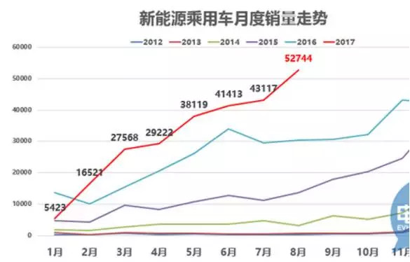 據(jù)乘聯(lián)會(huì)的數(shù)據(jù),2017年8月新能源乘用車銷量創(chuàng)有史以來單月銷量新高,達(dá)到52744臺(tái),環(huán)比7月增長1萬臺(tái),同比增速72%。