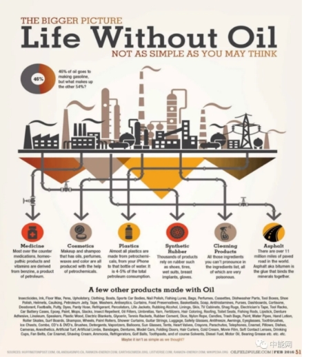 這只是我是有選擇性地挑了一些產品。就想一點,現在塑料和橡膠的應用有多廣泛:汽車的車體(部分)、醫療上的注射器、藥物的容器、水管、一次性飯盒、還有一些離不開的生活用品??梢哉f現代生活基本上就是建立在石油工業的基礎上的。