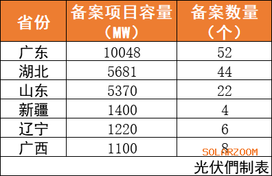 從省份來看,廣東、湖北、山東、新疆、遼寧、廣西等省份倍受投資企業的青睞。其中,廣東以52個項目、10.048GW規模位列所統計的15省備案數量及規模第一。目前,湖北、山東已在備案項目已突破過5GW,新疆、遼寧、廣西也已突破1GW。