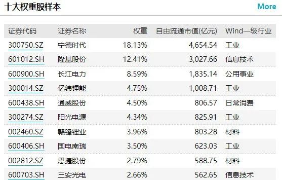 Wind數據顯示,光伏設備、儲能設備、水電等行業的權重占比較高,依次為29.8%、23%、11%,是未來我國新能源重點發展的領域,受到“碳中和”政策的催化。從成分股來看,中證內地低碳經濟主題指數所篩選的成分股為低碳主題龍頭,寧德時代和隆基股份權重最大的兩家公司。