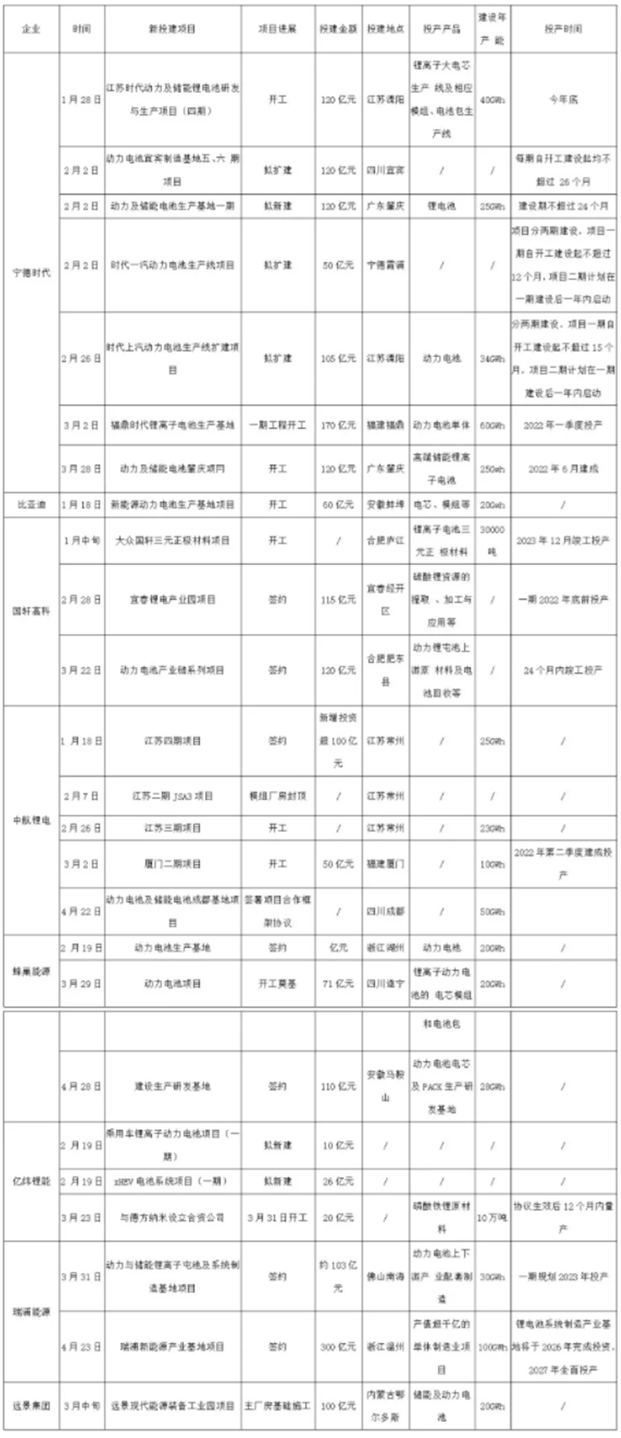 2021年1-4月份部分電池企業擴產情況