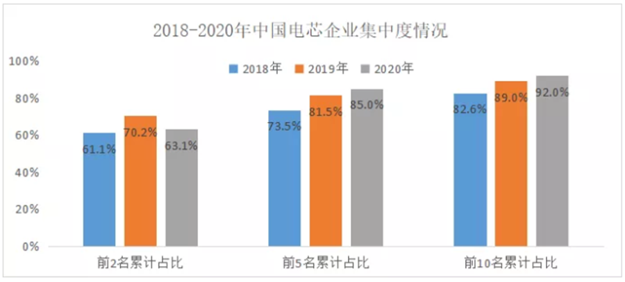 隨著新產能的崛起,電池領域的馬太效應已經愈發明顯。根據整車出廠合格證數據也可以看出,除了去年前2名電芯企業市場占比相比2019年略有下降,前5名和前10名的占比情況都有明顯增長,可見電池企業集中度在不斷提升。