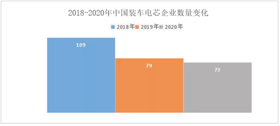 除了頭部企業占比在不斷提升,整體電池企業的數量也在減少。2018年時,配套整車的電池企業達到109家,2019年降低到79家,2020年再減少為73家。雖然不斷有新勢力企業冒出,但是整體數量減少的趨勢沒有改變。