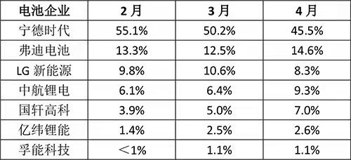 作為龍頭的寧德時代1-4月裝機量達到16.04GWh,前4個月總的市占率仍然超過中國市場裝機量的一半,達到50.7%,但如前所述,其自2月份以來,市占率在逐漸下降。