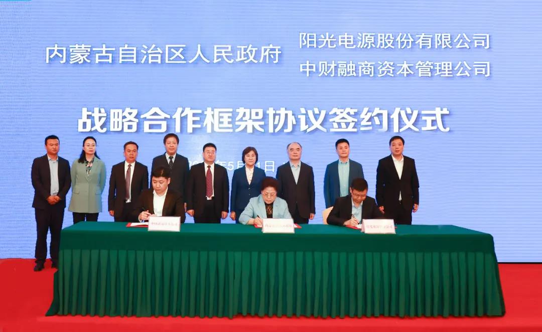 5月21日,陽光電源與內蒙古自治區人民政府、中財融商在北京簽署戰略合作協議。內蒙古自治區黨委副書記、自治區主席布小林,中國光伏行業協會理事長、陽光電源董事長曹仁賢等出席儀式并見證簽約。內蒙古自治區副主席艾麗華、陽光新能源公司總裁張許成、中財融商董事長馮大任代表各方簽約。