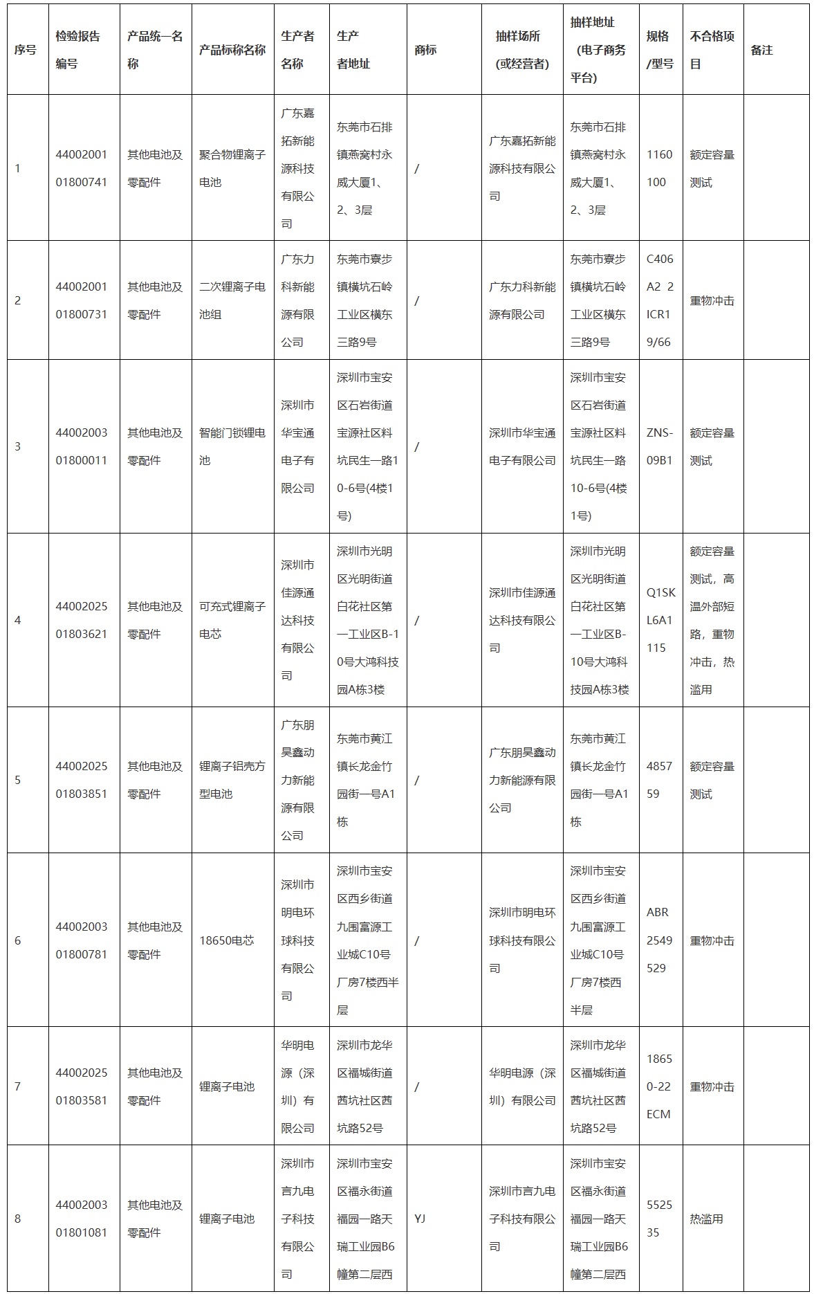 5月25日,廣東省市場監督管理局發布2020年度廣東省電池產品質量監督抽查情況的通告,本次共對155家企業生產的鋰離子電池、其他電池及零配件等2類346款電池及其零部件產品質量開展了監督抽查,發現廣東嘉拓新能源、廣東力科新能源、深圳市華寶通電子、深圳市佳源通達、廣東朋昊鑫動力、深圳市明電環球、華明電源、深圳市言九電子等8家電池企業生產的8款產品不合格。不合格項目主要有:“額定容量測試”“重物沖擊”“高溫外部短路”“熱濫用”。