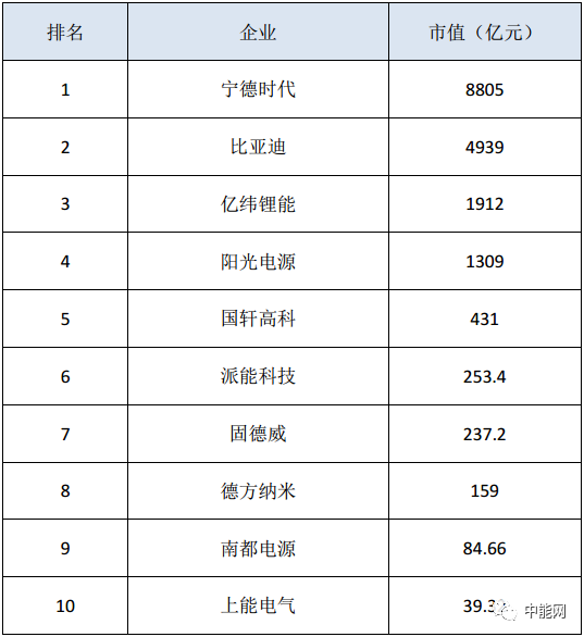 市值方面,寧德時(shí)代遙遙領(lǐng)先,達(dá)到8805億元,比亞迪緊隨其后市值達(dá)到4939億元。此外億緯鋰能、陽(yáng)光電源、國(guó)軒高科、派能科技、固德威、德方納米、南都電源、上能電氣等企業(yè)市值分別為:1912億元、1309億元、431億元、253.4億元、237.2億元、159億元、84.66、39.32億元。
