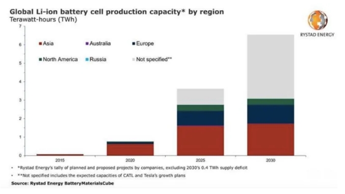 特斯拉目前的總產能只有50GWh,所以3TWh的目標是其當前產能的60倍之巨。根據特斯拉現有生產設施,部分新增產能預計將來自其位于內華達州的旗艦工廠。該工廠目前年產能為20GWh,但目前的運營水平僅為其最終產能的30%。然而,即使該廠滿負荷運轉,也無法實現3TWh這一目標。特斯拉還在紐約和中國上海擁有超級工廠,并正在德克薩斯州的奧斯汀和德國的柏林建造超級工廠。該公司計劃在世界各地建立更多的超級工廠,日本、韓國、英國和印度等國都是傳聞中的候選基地。下圖中的灰色區域表示未指定區域的產能,其中大部分屬于特斯拉,Rystad認為到2030年全球EV產業將需要這么多的電池生產。然而,從圖中可以看出,大部分現有和承諾中的產能均位于亞洲,但一半以上的新增產能尚未確定生產位置。