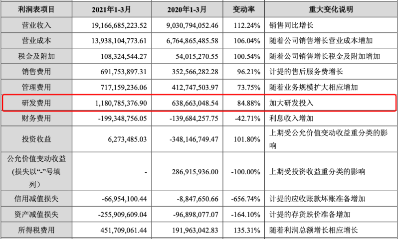 ▲2021年第一季度寧德時代的研發(fā)投入情況