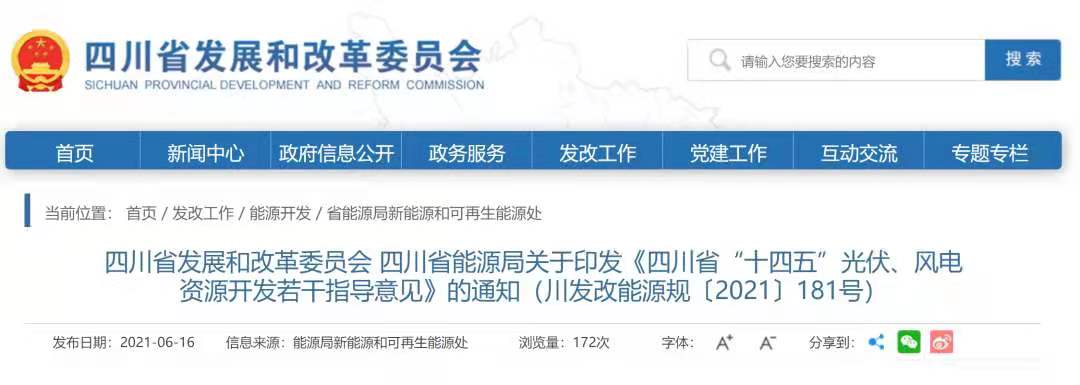 四川省發展和改革委員會 四川省能源局關于印發《四川省“十四五”光伏、風電資源開發若干指導意見》的通知