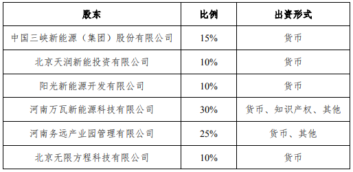 金風科技全資子公司北京天潤新能投資有限公司、與三峽新能源、陽光新能源開發有限公司、河南萬瓦新能源科技有限公司、河南務遠產業園管理有限公司、北京無限方程科技有限公司共同簽署協議,在河南省新鄉市合資成立新公司“河南新電能源投資發展有限公司”,注冊資金5億元。合資公司股權如下: