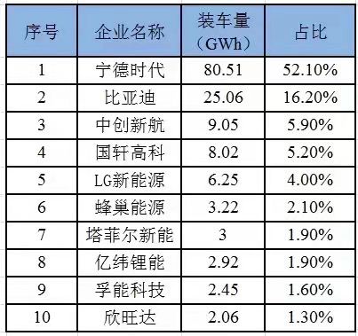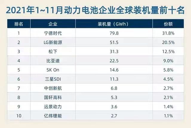 2021年全年,國(guó)內(nèi)動(dòng)力電池裝車量前十名分別是:寧德時(shí)代、比亞迪、中創(chuàng)新航、國(guó)軒高科、LG新能源、蜂巢能源、塔菲爾新能源、億緯鋰能、孚能科技、欣旺達(dá),其中寧德時(shí)代以52.10%的占比高居榜首。