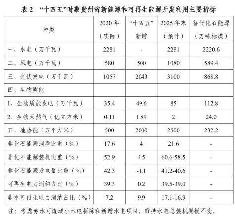 4月19日,貴州省能源局發布《貴州省新能源和可再生能源發展 “十四五”規劃》,根據《規劃》,到2025年,新能源與可再生能源發電裝機6546萬千瓦;非水電可再生能源裝機4265萬千瓦。其中水電裝機2281萬千瓦,風電裝機1080萬千瓦,光伏發電裝機3100萬千瓦,生物質能發電裝機85萬千瓦。由下表可知,貴州“十四五”新增風電5GW,光伏20.43GW。