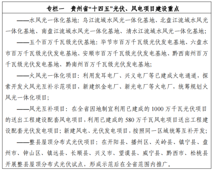 積極推進風光水火儲一體化發展。以大型水電基地及現有(規劃)火電廠為依托,統籌本地消納和外送,建設烏江、北盤江、南盤江、清水江流域四個水風光一體化可再生能源綜合基地以及風光水火儲多能互補一體化項目。充分利用水電及火電的調節能力,合理布局新型儲能或抽水蓄能,優化調度、聯合運行、高效利用,建設水(火)風光儲一體化可再生能源綜合開發基地,降低可再生能源綜合開發成本,提高水電或火電送出通道利用率。