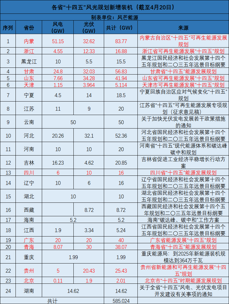 風芒能源根據公開信息不完全整理,截至目前,已有24個省(市)“十四五”相關規劃出爐。這些省(市)規劃在“十四五”期間,新增風光裝機約585GW。