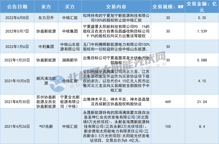 中核集團新能源擴張以開發與收購并舉,不僅在大型電站、整縣分布式光伏方面大動作不斷,在電站收購上,據北極星太陽能光伏網統計,2021年以來中核旗下中核山東、湖南新華及中核匯能收購光伏電站規模近700MW,交易金額超35億元。
