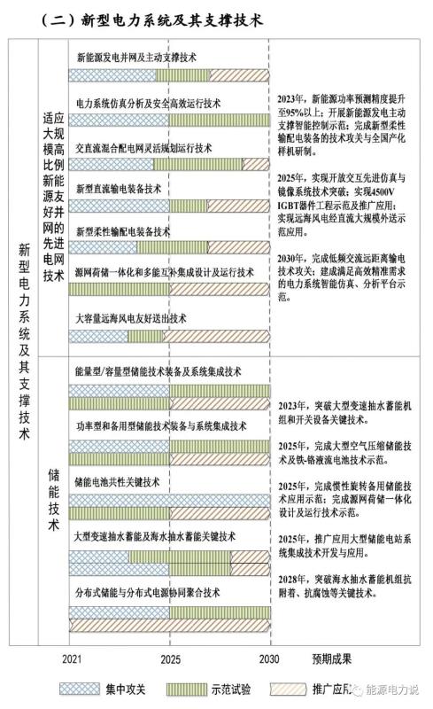 4月2日,國家能源局、科學(xué)技術(shù)部印發(fā)《“十四五”能源領(lǐng)域科技創(chuàng)新規(guī)劃》?!兑?guī)劃》發(fā)布了先進(jìn)可再生能源發(fā)電及綜合利用技術(shù)、新型電力系統(tǒng)及其支撐技術(shù)、能源系統(tǒng)數(shù)字化智能化技術(shù)等5大技術(shù)路線圖。其中在新型電力系統(tǒng)技術(shù)路線圖中,也公布儲能技術(shù)路線圖,“十四五”儲能技術(shù)創(chuàng)新包括: