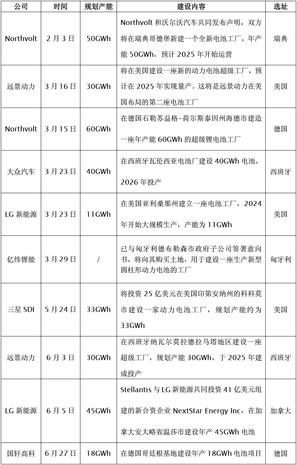 據電池中國不完全統計,僅今年1-6月,遠景動力、Northvolt、LG新能源、億緯鋰能、國軒高科、三星SDI和大眾汽車等在歐洲、北美等地官宣新建的動力電池項目就超過300GWh,此外還有不少企業蠢蠢欲動,更多項目正在緊鑼密鼓地商談之中。