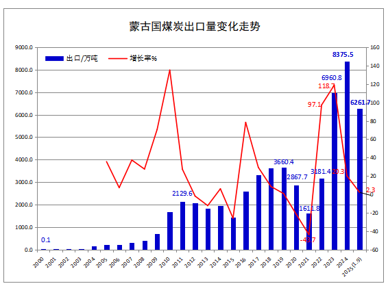 據蒙古國海關機構(Mongolian Customs Service)發布的統計數據顯示,2025年1-9月,蒙古國煤炭出口量累計為6261.68萬噸,比上年同期增加139.2萬噸,同比增長2.3%。