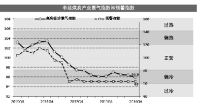 2014年中經煤炭產業景氣指數(由經濟日報社中經產業景氣指數研究中心和國家統計局中國經濟景氣監測中心共同編制)較2013年微跌0.2點,景氣值為95.9,繼續維持低位運行,預警指數連續8個季度走平(63)。