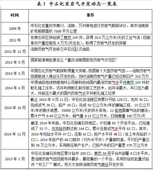 在中石化頁巖氣實現(xiàn)商業(yè)性開發(fā)之前,其為找頁巖氣曾花費20億元,打了15口空井,但并沒有找到氣。之后中石化一直堅持不懈,終于在國內頁巖氣勘探開發(fā)方面趕在了前列。近些年來在頁巖氣開發(fā)的一些進展,具體如下表所示。