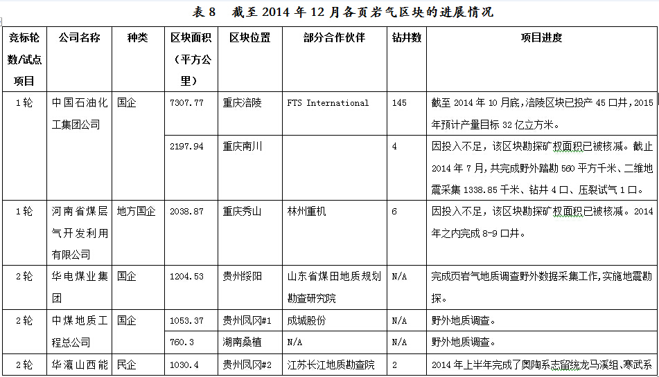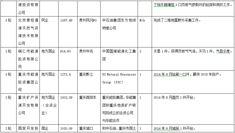 目前,頁巖氣第二輪招標中19塊區(qū)塊的中標企業(yè)大部分企業(yè)正在制定勘探實施方案,并沒有進入實際性的勘探階段。具體進展情況見下表。