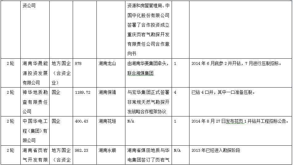 第二輪頁巖氣礦業(yè)權出讓中標單位,大都完成了二維地震勘探。部分企業(yè)完成預探井鉆探,多數(shù)企業(yè)處于探井井位論證階段或預探井開鉆階段;還有部分企業(yè)處于觀望階段。截至2015年2月,除一二輪招標區(qū)塊之外,在湖南慈利縣、山東東營、內蒙古自治區(qū)鄂爾多斯市的頁巖氣勘探都取得了重要突破。