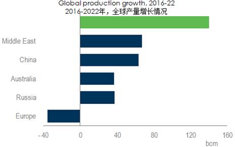 在供應方面,美國現在已經是世界上最大的天然氣生產國,美國目前的增長速度也是全球最高的,到2022年,美國將占全球產量增長的40%。此外,中東地區產量將繼續增長;中國也將成為第四大天然氣生產國。