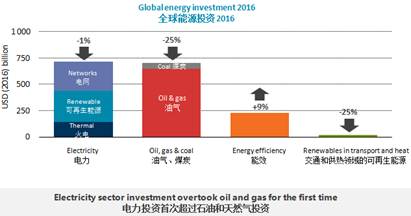 2016年,由于電網建設投資的增長基本抵消了由燃煤發電投資的減少,全球電力的投資幾乎維持在7180億美元。電力投資中最多的部分——以可再生能源為基礎的電力投資,在去年也下降到2970億美元,降幅3%。與五年前相比,可再生能源的投資也降低了3%,不過隨著太陽能光伏和風能的成本下降與技術進步,可再生能源的發電量將增加35%。