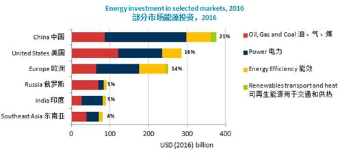 中國作為世界上最大的能源投資者,2016年占全球總投資的21%,雖然去年中國在燃煤電力領域的投資降低了25%,但是清潔能源發電、電網建設和能效方面的投資則日益增加。在美國,雖然2016年石油和天然氣的投資急劇下降,但其能源投資仍然占全球總投資的16%。印度是去年增長最快的主要能源投資市場,由于政府大力推動現代化和電力行業的發展,其能源投資增長了7%,從而穩居全球第三大能源投資市場。