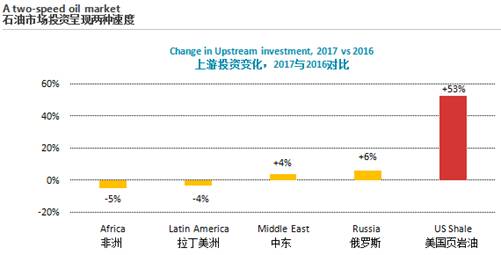 《報告》顯示,在經歷了兩年史無前例的下降后,全球石油和天然氣上游的投資預計將在2017穩定下來。然而,美國頁巖氣投資的上升與世界其他地區的停滯形成對比,這預示著石油雙速市場的出現。與此同時,石油和天然氣行業正在通過大量的成本節約、技術開發以及高效的項目執行來取得改觀。