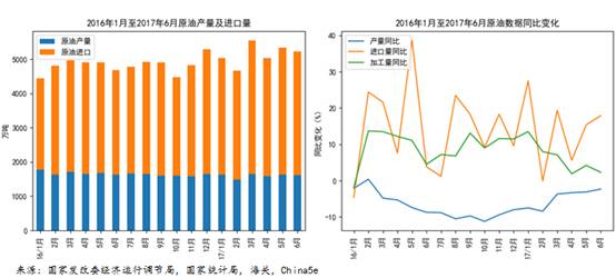 成品油方面,成品油消費量平穩增長,預計2017年全年成品油消費量同比增長≤5%(2016年為5.0%);為消納過剩產能,成品油出口增速曾遠高于產量、消費量增速,但受出口配額收緊等因素影響,二季度大幅回落;企業加工貿易出口方式受限,可以看出政府不鼓勵大量進口原油用于加工出口。