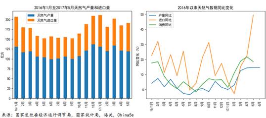 同一天發布的《中國能源網能源行業研究報告•2017年第二季》顯示,受經濟好轉、煤改氣政策、點供快速發展等因素影響,2017年以來,天然氣產量、消費量、進口量同比均有大幅攀升,前5月對外依存度略高于2016年,超過35%。