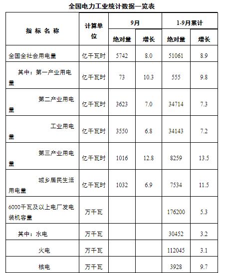 10月26日,國家能源局發布1-9月份全國電力工業統計數據。1-9月份,全國全社會用電量51061億千瓦時,同比增8.0%;全國售電量41933億千瓦時,同比增10.5%。