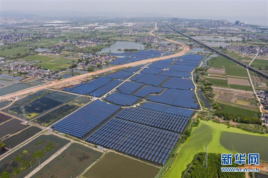 4月16日,空中俯瞰古龍村的“漁光互補”項目現(xiàn)場(無人機照片)。近期,在浙江省長興縣洪橋鎮(zhèn)古龍村的“漁光互補”項目現(xiàn)場,光伏板下的魚塘中養(yǎng)殖的淡水鱸魚和小龍蝦陸續(xù)上市,成為當?shù)仞B(yǎng)殖戶的重要增收來源。該“漁光互補”項目占地500畝,水上光伏板發(fā)電,水下魚塘養(yǎng)殖鱸魚、鯽魚、小龍蝦等,“一地兩用”極大提高單位面積土地的經(jīng)濟價值。該光伏發(fā)電項目年發(fā)電量可達2000多萬千瓦時,每年可獲得售電收入1000多萬元,魚蝦養(yǎng)殖年收入200多萬元,達到一地兩用、助農(nóng)增收的效果。