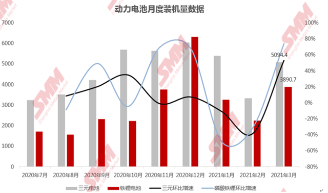 而從材料類型劃分來看,3月我國動力電池市場三元電池仍然占據主導地位,三元電池共計裝車5.1GWH,同比上漲129%,環比上升53.1%。而磷酸鐵鋰電池裝車3.9GWH,同比上升627.9%,環比上升73.7%。