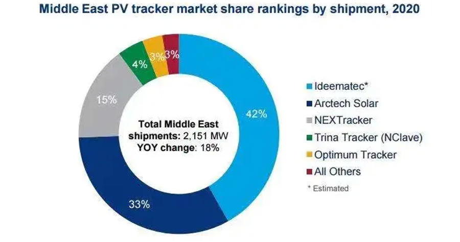 中東市場在2020年總計有2.15GW的光伏跟蹤支架出貨,Ideematec和中信博分別以42%(估算數據)和33%的市場占比排在前兩位。NEXTracker以15%的市場占比排在第三位。
