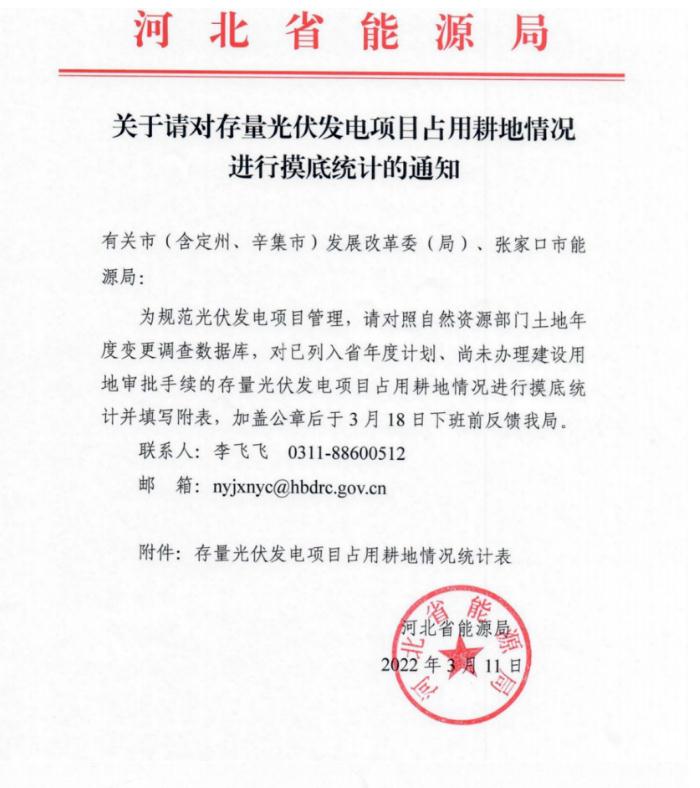 3月11日,河北省能源局啟動存量光伏電站占用耕地摸底統(tǒng)計工作,文件要求對照自然資源部門土地年度變更調查數(shù)據庫,對已列入省年度計劃、尚未辦理建設用地審批手續(xù)的存量光伏發(fā)電項目占用耕地情況進行摸底統(tǒng)計。附表信息統(tǒng)計中包括項目名稱、開發(fā)企業(yè)、備案證號、建設規(guī)模及地點、納入計劃批次以及場址總面積、已占用面積以及建設進度等多項詳細信息。