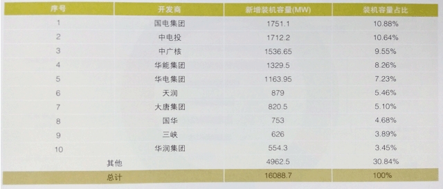 2013年中國風電新增裝機排名前十的開發商市場份額